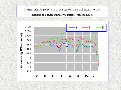 La producción animal empleando pasturas subtropicales mejoradas es una alternativa en una extensa área del Norte Argentino que posee condiciones aptas para su implantación. La selección de especies, cultivares y sistemas de utilización frecuentemente reposa en apreciaciones subjetivas debido a limitaciones para efectuar evaluaciones en un amplio rango de situaciones productivas. Se ha propuesto que la simulación empleando modelos basados en procesos biológicos podría orientar dichas evaluaciones y mejorar la extrapolación de sus resultados. Este trabajo tuvo como objetivo realizar un ejercicio de simulación para evaluar el impacto de la carga animal y del nivel de suplementación sobre la productividad animal utilizando un modelo que considera la dinámica de producción y pérdida de tejido foliar de la pastura, la distribución de la oferta nutritiva para el ganado y la evolución de los requerimientos nutricionales de los animales. El modelo empleado, dinámico, mecanístico y determinístico, es una extensión del propuesto por Johnson y Parsons (1985), y representa el flujo de tejidos mediante ocho compartimientos tisulares (4 de láminas y 4 de vainas y tallo) en intervalos diarios. Los parámetros de la pastura correspondieron a Setaria sphacelata cv. Narok fertilizada con 600 kg N/ha repartidos en 3 aplicaciones y 100 kg P/ha incorporados en la siembra. El intervalo de aparición de hojas empleado fue de 78.2 °C-días acumulados sobre una temperatura base de 8 °C, y la acumulación foliar máxima fue de 5 hojas. Las variables climáticas correspondieron a Reconquista, Prov. de Santa Fe, entre 1989 y 1992. Las pasturas fueron utilizadas en forma continua entre el 1ero de noviembre de cada año y el 30 de junio del año siguiente con terneros de frame 5 y 220 kg de peso vivo inicial, cuyos requerimientos y ganancias fueron estimados según recomendaciones del NRC (1996). El modelo fue codificado y ejecutado en MATLAB 3.5. Se simuló un experimento con arreglo factorial completo de tres cargas animales (carga baja, CB: 5, carga media, CM: 6 y carga alta, CA: 7 animales/ha) y tres tipos de suplementación diaria con semilla de algodón (S: sin suministro, T: 0,25 % del peso vivo todo el período de pastoreo y E: 0,65 % del peso vivo en enero, febrero y junio), replicado en tres períodos independientes analizados como bloques. Se efectuaron análisis de varianza y pruebas de comparaciones múltiples de Tukey (a =0,0001).