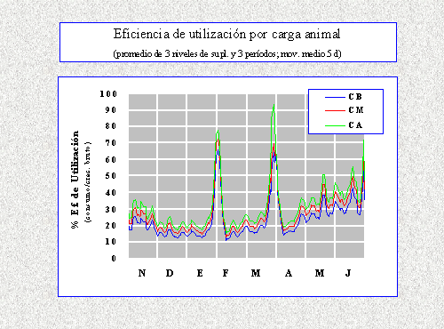 En los tratamientos que recibieron suplemento, este fue 189, 186 y 183 kg/animal/período en CB, CM, y CA (P<0,0001), y fue similar en T y E (P>0.89). En todos los casos la suplementación aumentó la producción de carne (cuadro 1). En promedio el incremento en T y E, respecto a S, fue del 29% para las dos variables presentadas. Por el contrario, T y E fueron similares. La carga animal inicial tuvo un comportamiento intermedio, incrementando la producción por superficie 16% entre CB y CA, y disminuyendo la producción por animal 17% entre CB y CA. Esto sugiere que deben priorizarse las evaluaciones con diferentes aportes totales de suplementos y relegarse las comparaciones de diferentes estrategias de suministro durante el período de pastoreo. La carga inicial no debería ser omitida en las evaluaciones. No obstante, estos resultados deben ser considerados con cautela ya que los submodelos, ajustes y supuestos incorporados al modelo no fueron validados. La inclusión de estos elementos obedece a la existencia de aspectos conceptual y/o cuantitativamente mal conocidos que involucran: 1) parámetros morfogenéticos (tasa de aparición de hojas, acumulación de hojas y otros); 2) efecto del estrés hídrico y del nivel nutricional sobre los procesos de crecimiento y senescencia; 3) efecto de temperaturas extremas (heladas y calentamiento o "cocido"; 4) variaciones en el valor nutricional del forraje al avanzar su madurez en diferentes condiciones ambientales; 5) estructura de la pastura (distribución horizontal y vertical de componentes vegetativos y reproductivos) con y sin defoliación; y 6) variaciones del consumo animal relacionadas al valor nutricional del forraje, la estructura de la pastura y las condiciones ambientales. Se concluye que el desarrollo de modelos que representan el flujo de tejidos de pasturas subtropicales provee una metodología potencialmente valiosa para el diseño de estrategias de utilización de las mismas. Sin embargo, actualmente, su aplicación revela vacíos de información referida al funcionamiento de las pasturas en relación con el ambiente y el manejo.